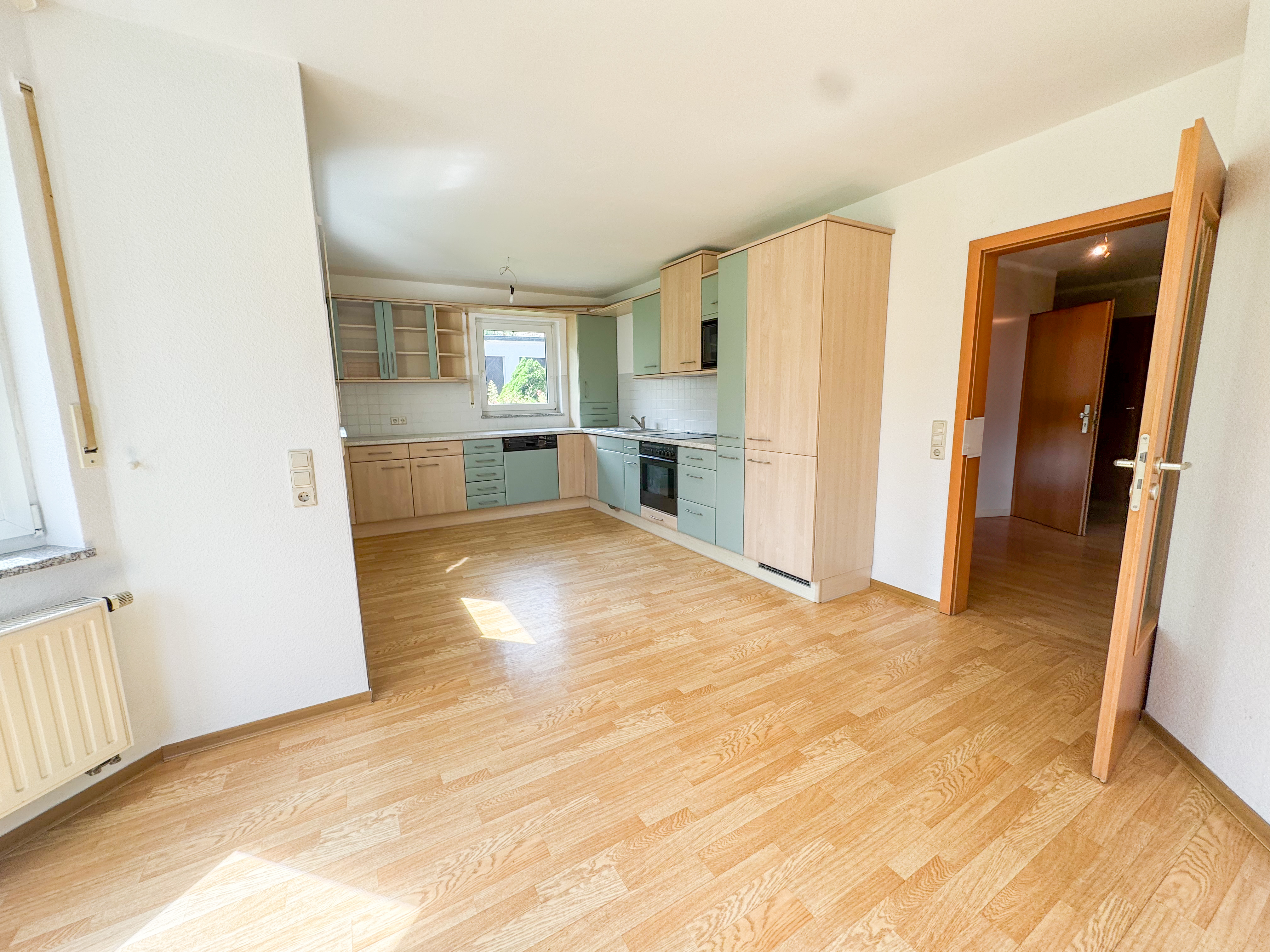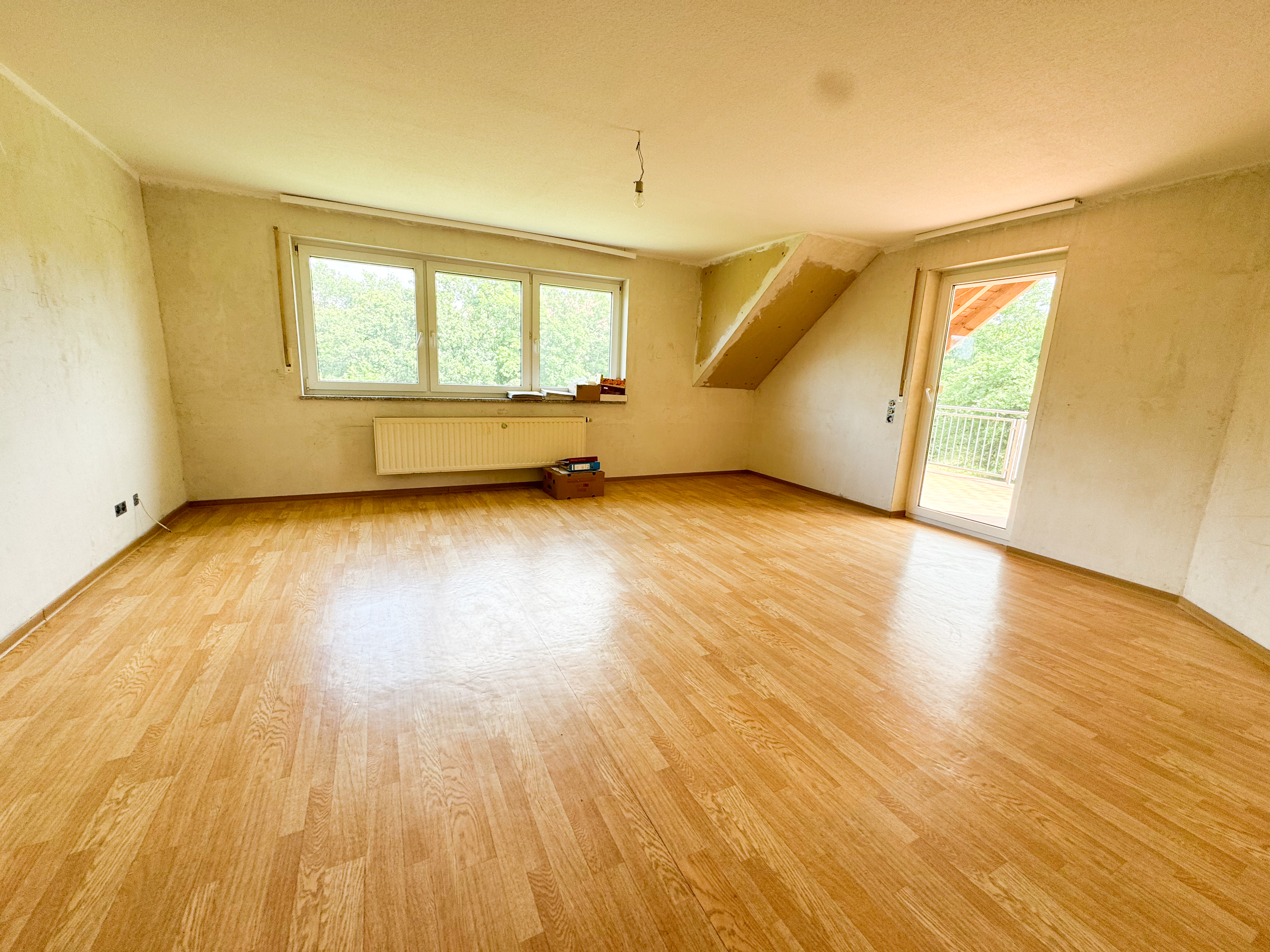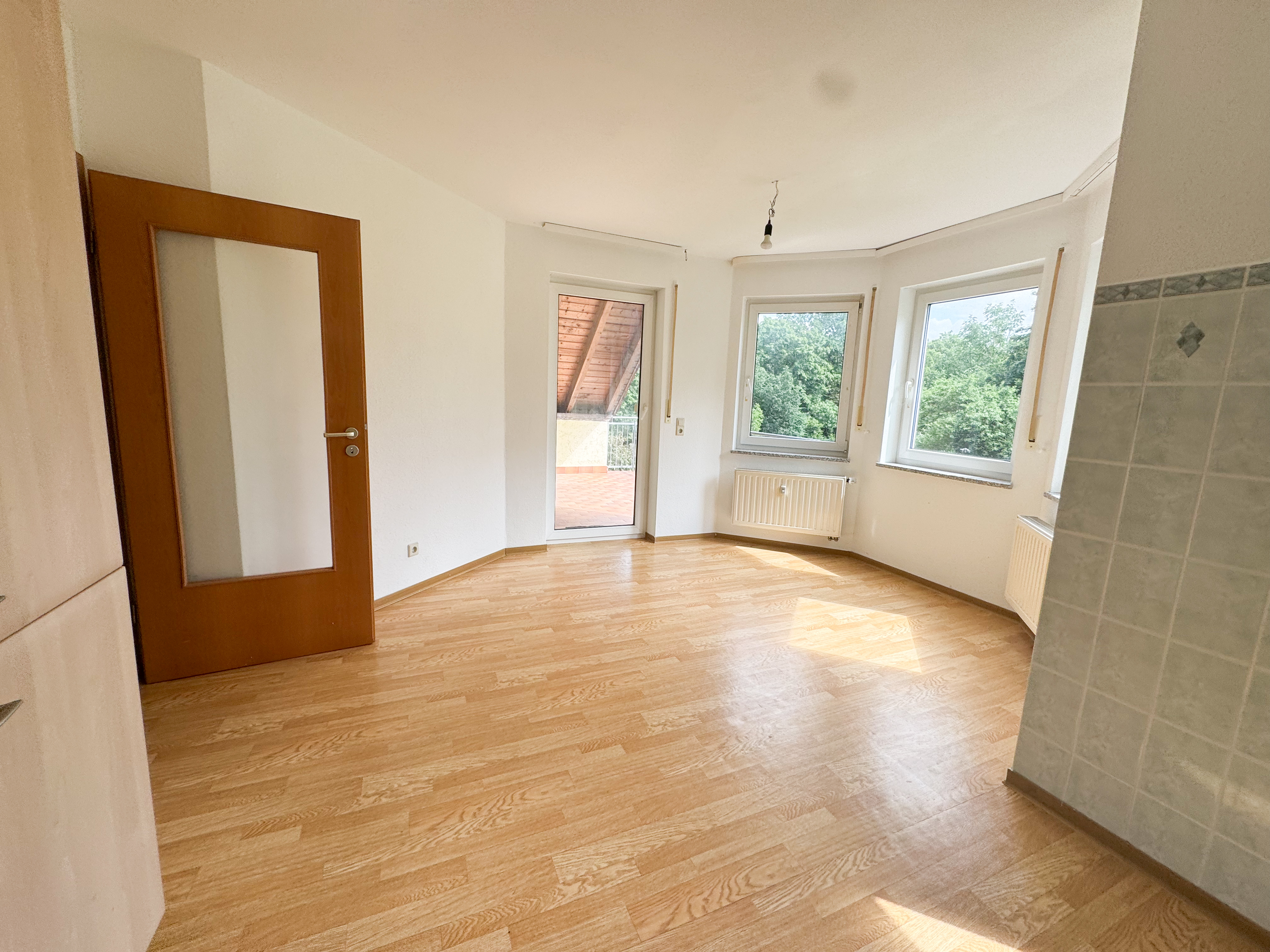 Dachgeschoss: Essküche/Wohnzimmer mit Zugang zum Balkon, Schlafzimmer und Badezimmer.