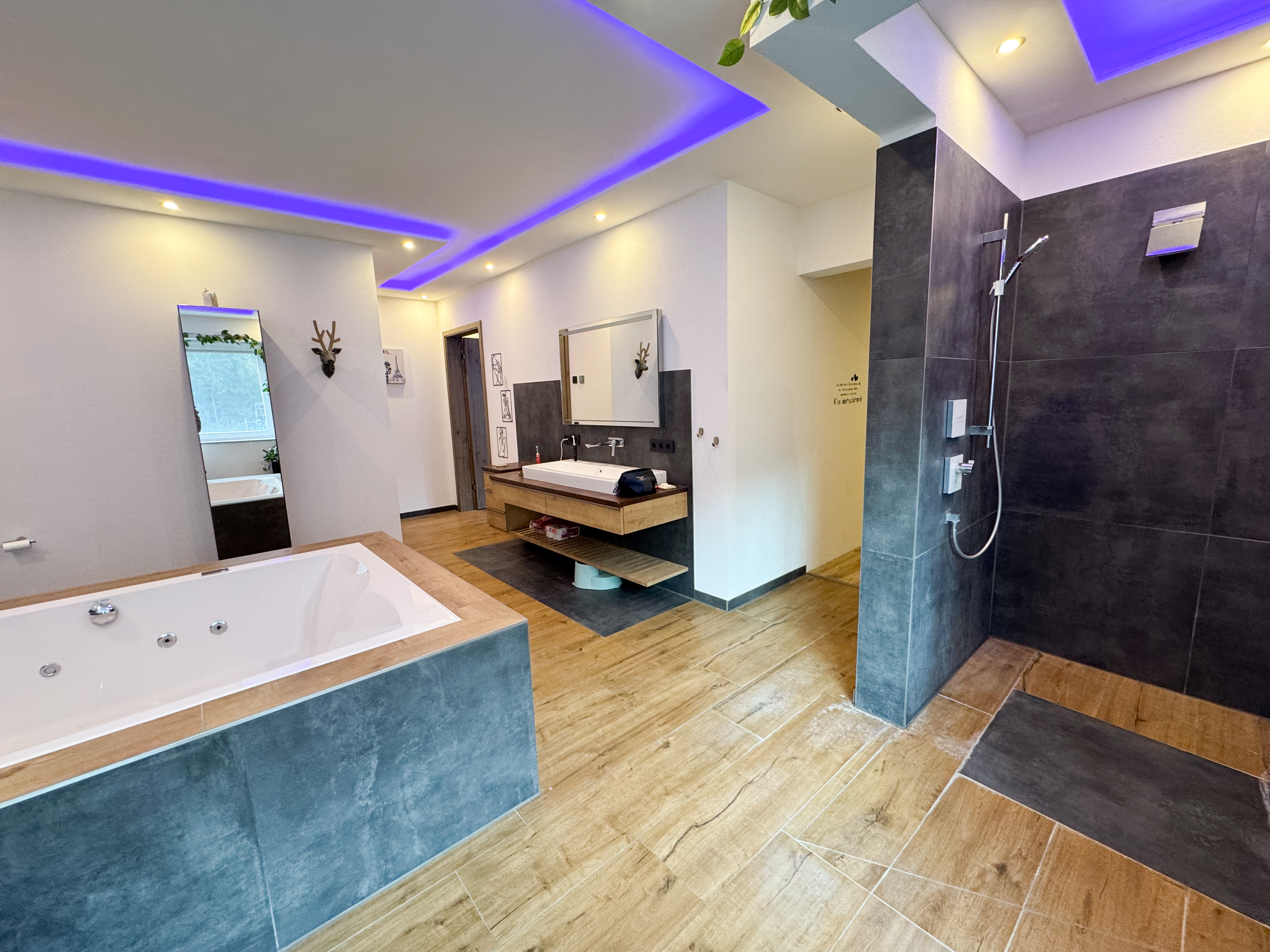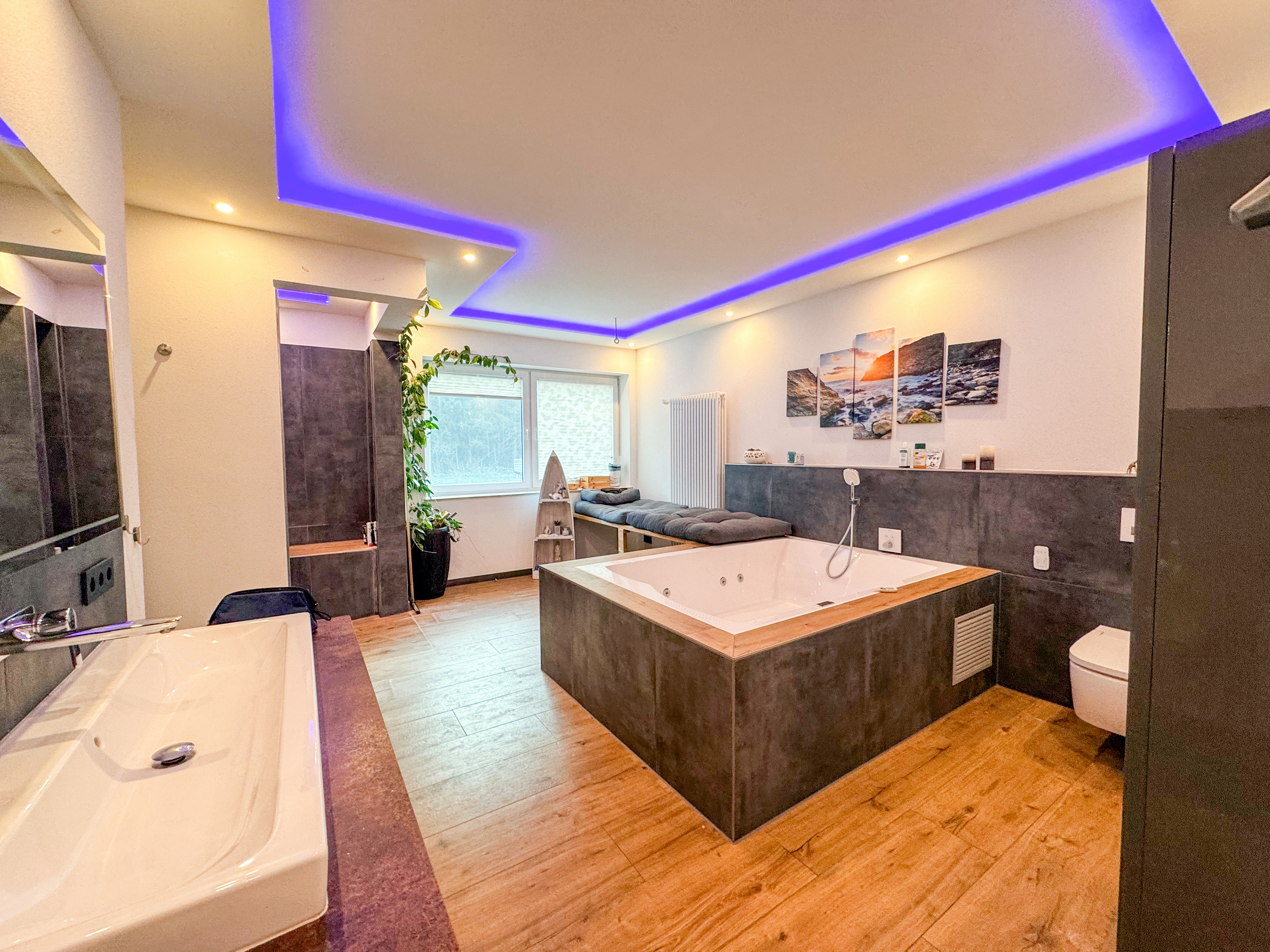 Das Wohlfühlbad mit Fenster, bodentiefer Dusche und Whirlpool Badewanne sorgen schon am Morgen für gute Laune.