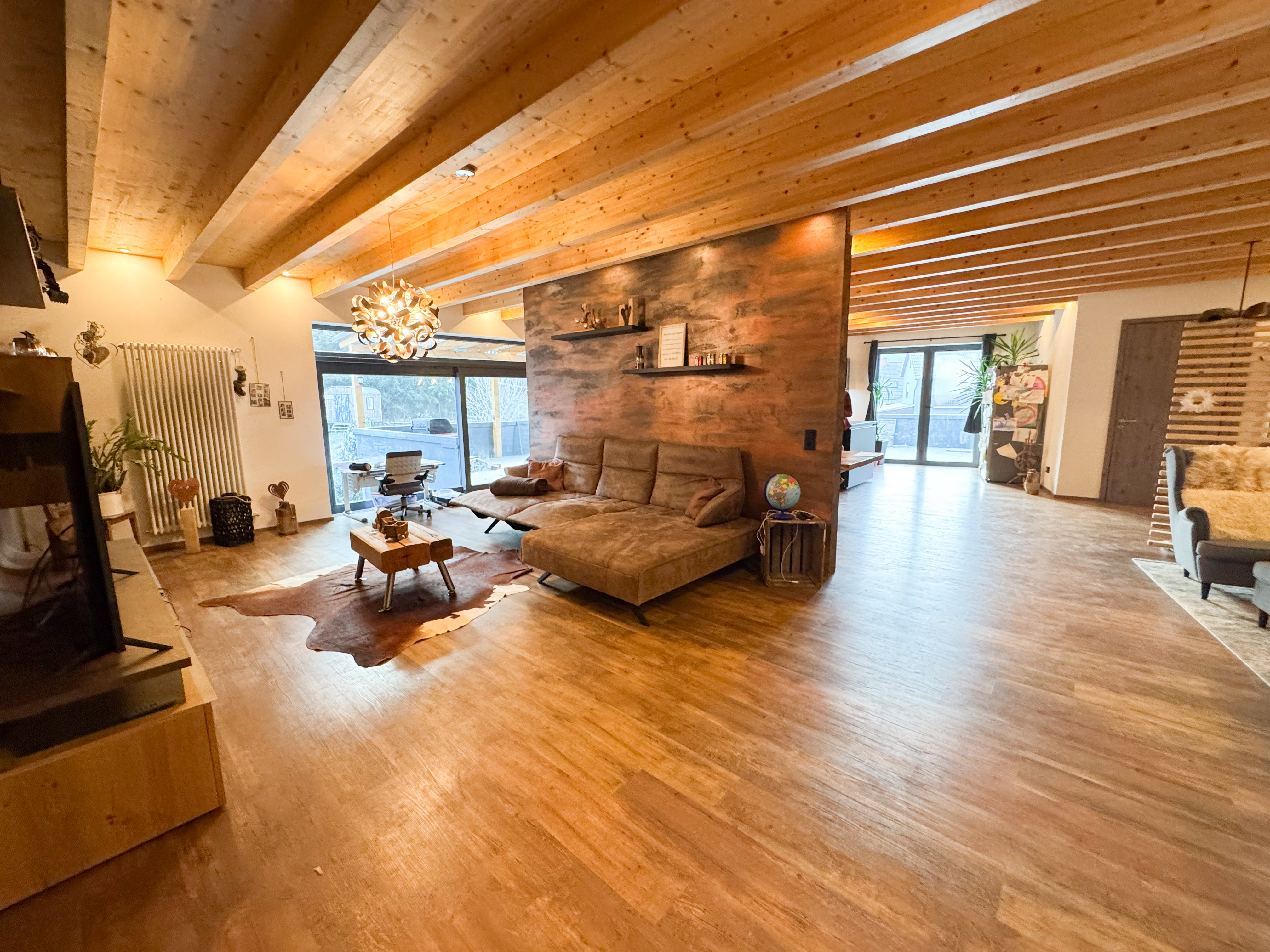 Edle Böden, die zum Barfußlaufen einladen, das großzügig geschnittene, lichtdurchflutete Wohn-/Esszimmer mit integrierter Küche lassen keine Wünsche offen.