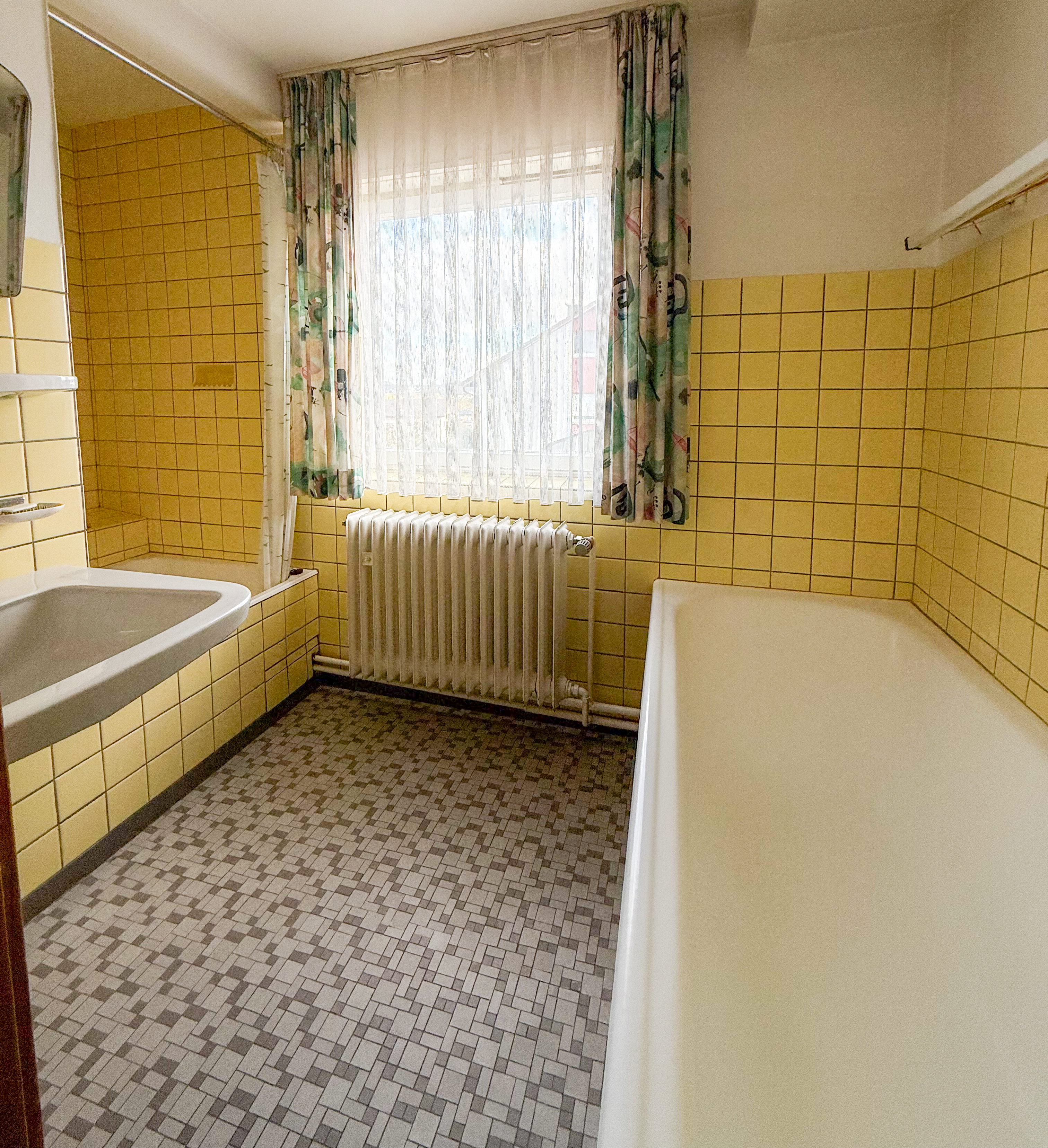 - Ausstattung des Bades Badewanne, Dusche, Fenster